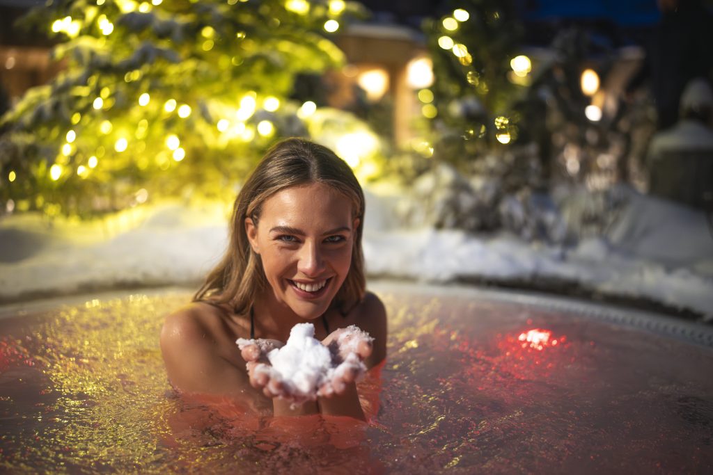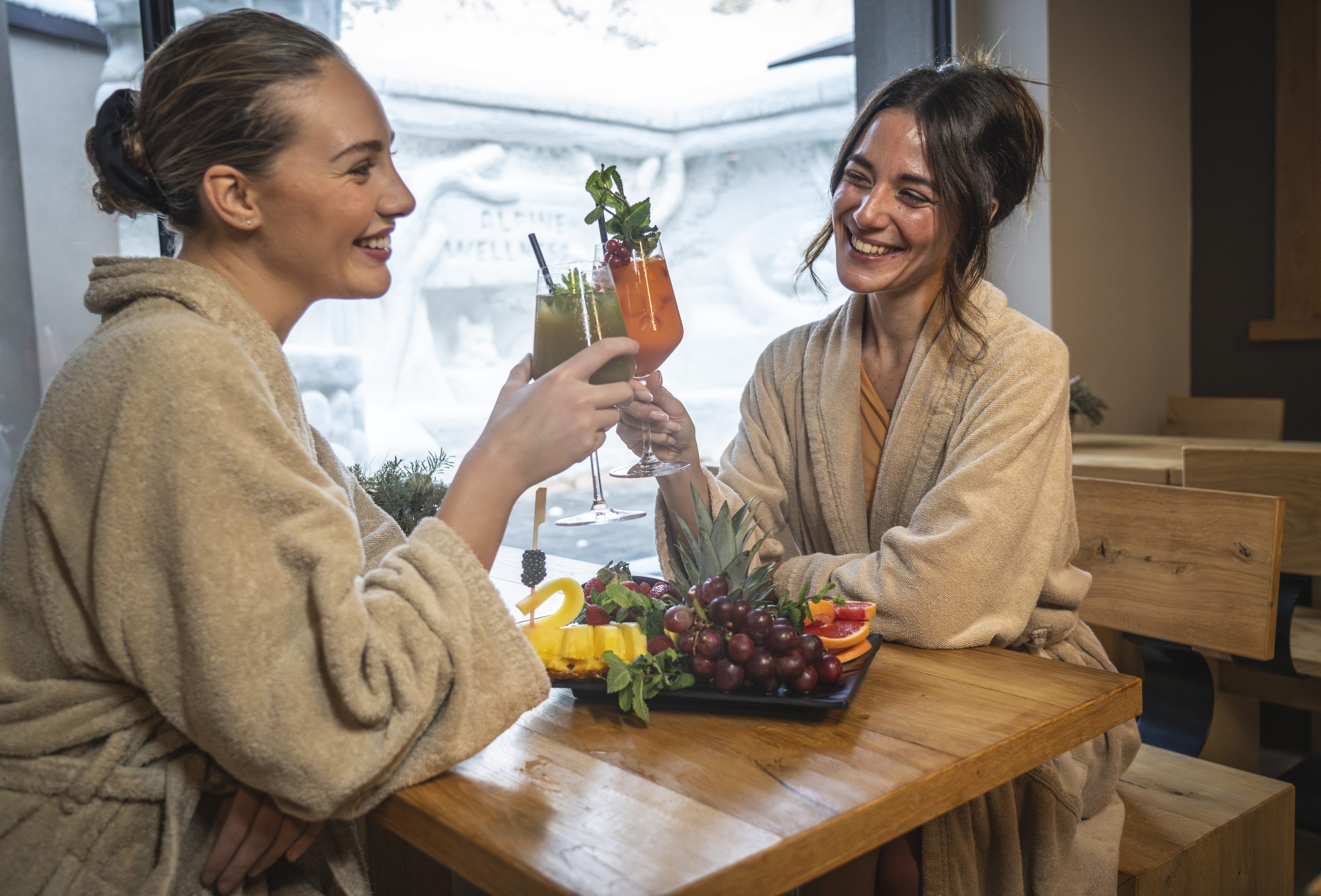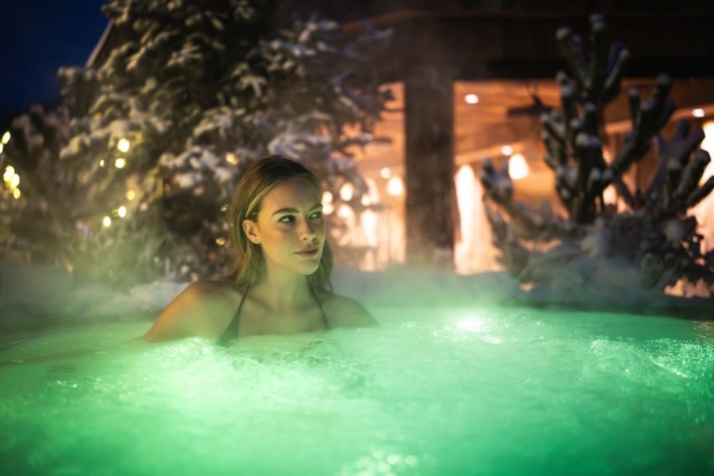 Ingresso libero nell’area Alpine Wellness, quando vuoi tu: sauna panoramica, bagno turco, idromassaggi e zone relax vista Alpi.