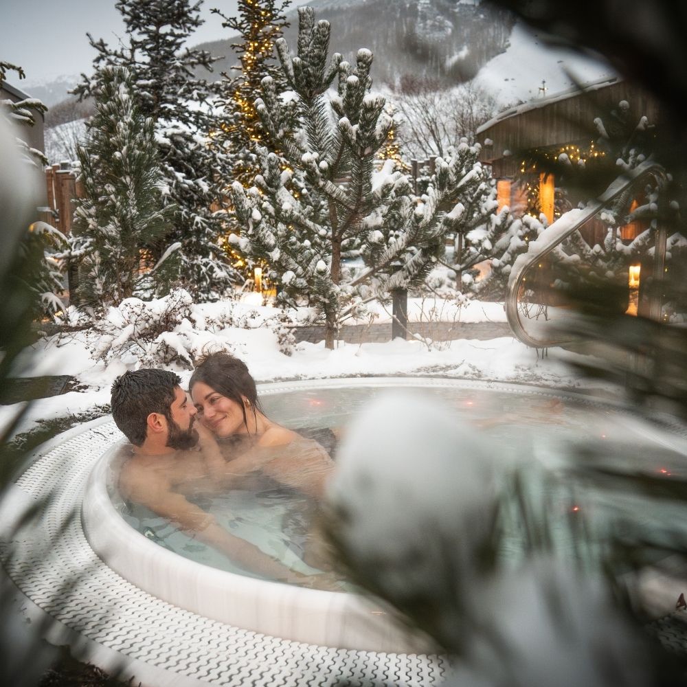 Per chi preferisce un’esperienza più sociale o semplicemente desidera immergersi in un mare di bolle, c’è una grande vasca idromassaggio circondata da piante e vista mozzafiato verso la cima denominata “Crap da la Parè” o il monte “Mot”.